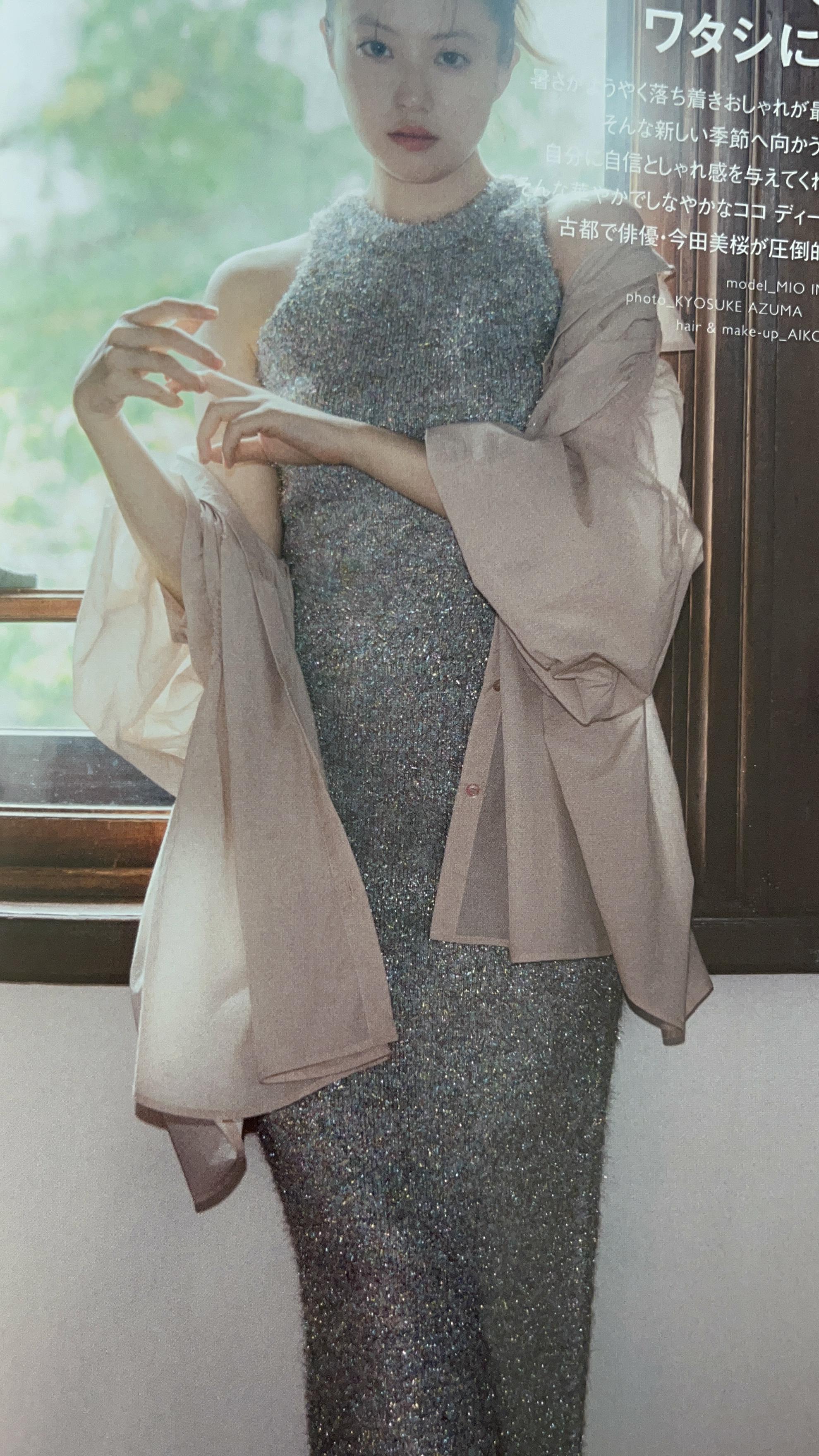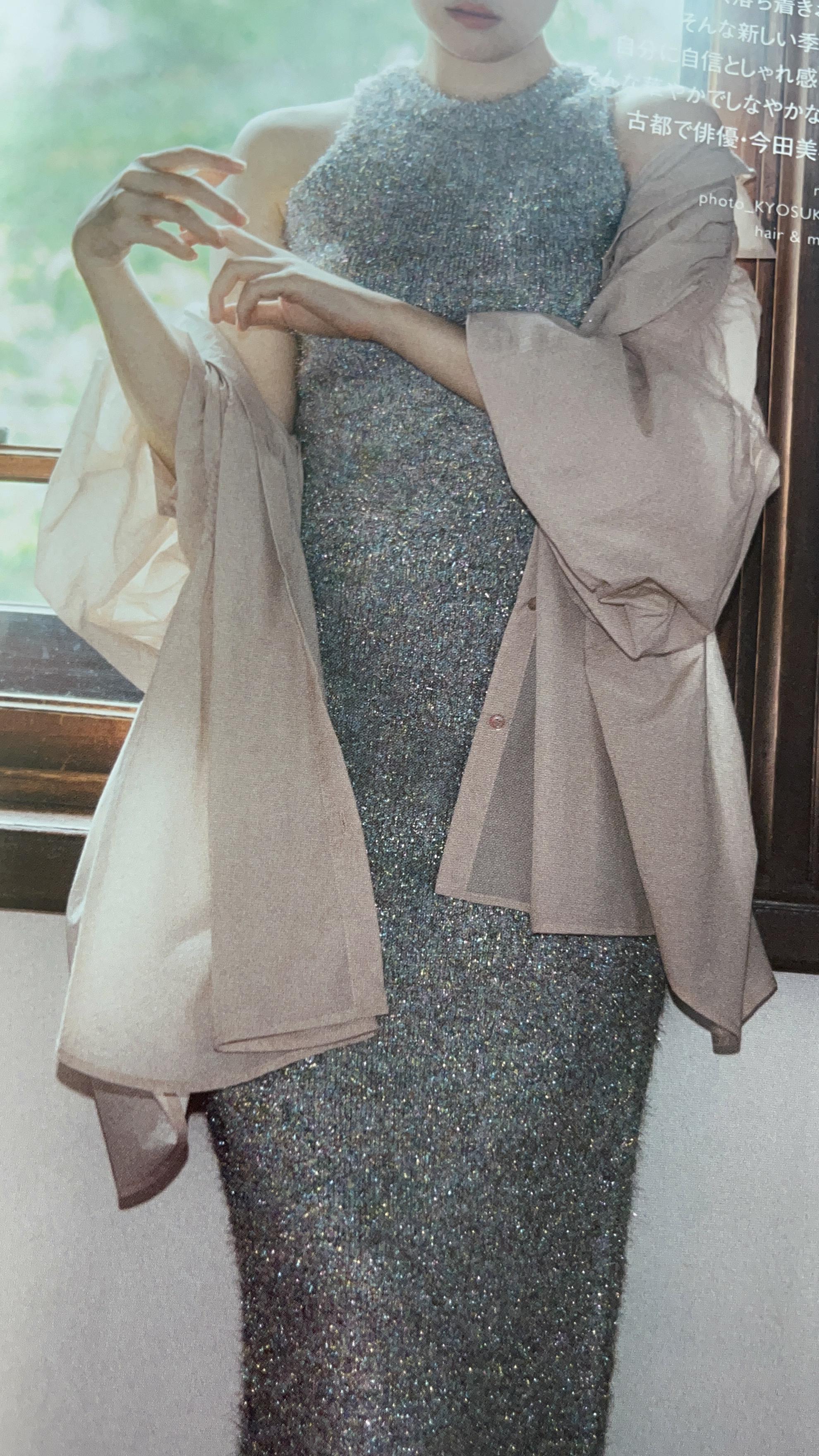 반짝이 소재의 화려한 원피스 + 시스루 소재의 긴 남방은 스타일을 한껏 돋보이고 멋스럽게 만들어줍니다.